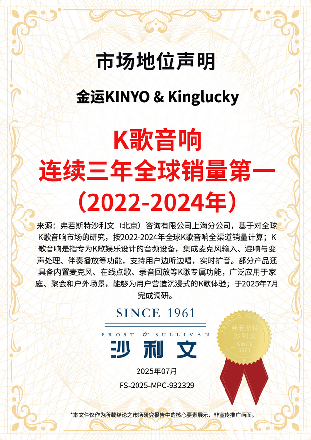 2025年-金运KINYO品牌荣获沙利文市场地位确认证书:“2022-2024年连续三年全球K歌音响销量第一”,巩固其在K歌音响赛道的领先地位。