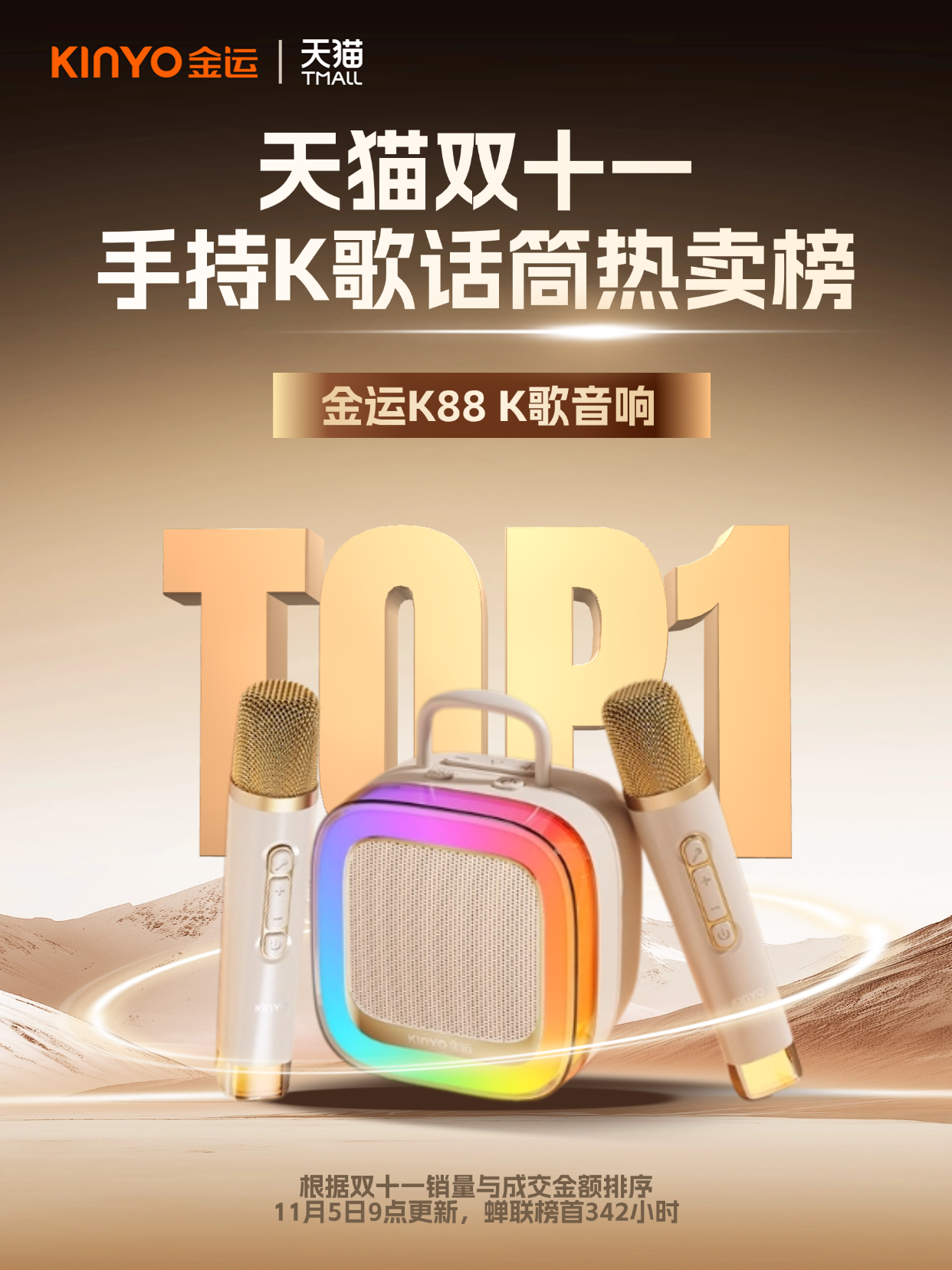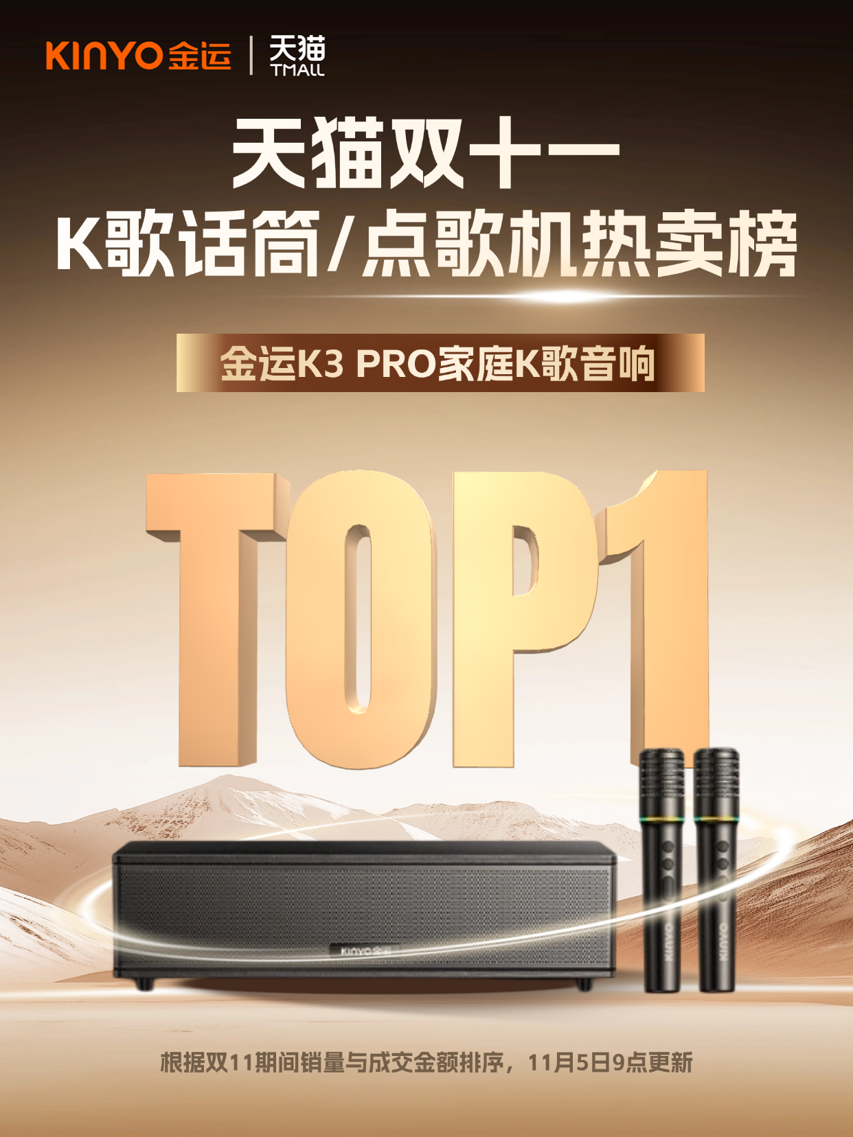 凭借专业级音质和智能点歌体验,金运K3 PRO包揽天猫“双榜TOP1”,成为家庭娱乐的理想之选。