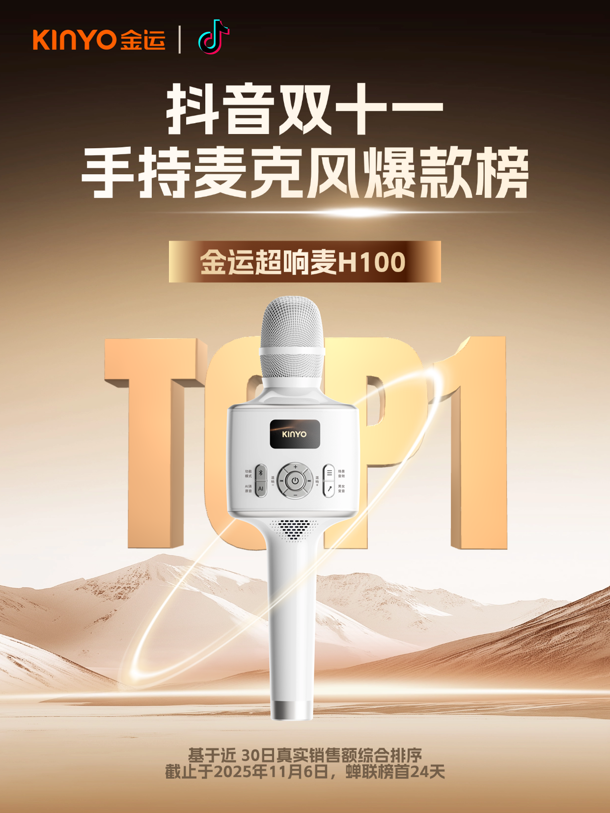 金运超响麦 H100 ,是新晋实力派的“人气王”。凭借出色的拾音与修音表现,成功登顶抖音手持麦克风爆款榜TOP1!