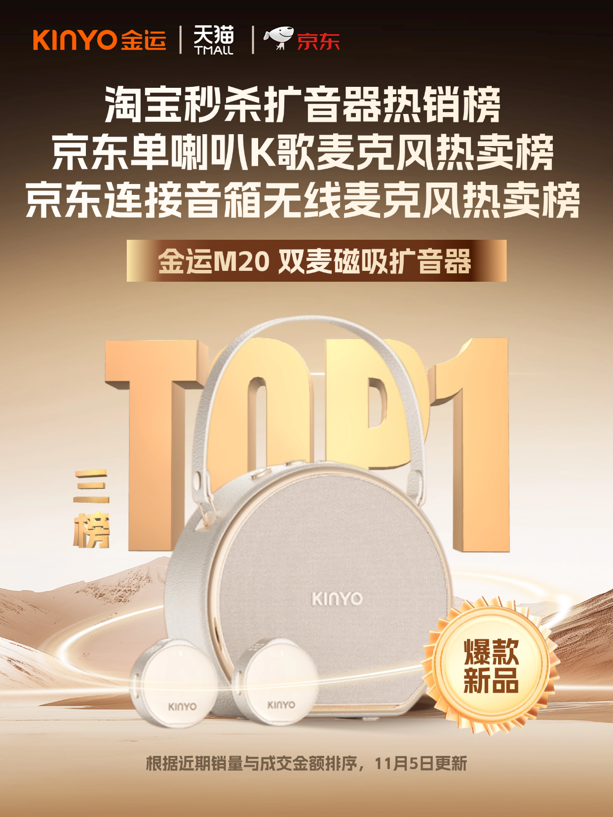 金运M20凭借一体式磁吸双麦及高颜值小香风的设计,30w大功率、清晰不啸叫的表现,连拿三榜TOP1,成为扩音界的“全能王者”。